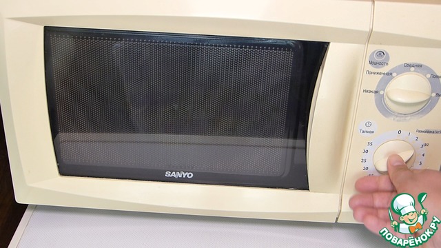 Отправляем в микроволновку на 3 минуты у меня максимальная мощность.