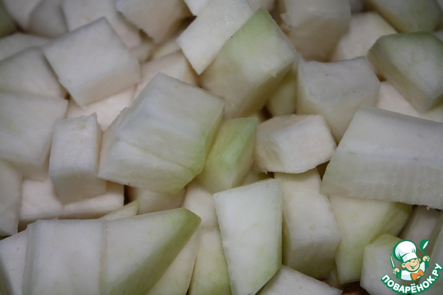 Нарезать кольраби кубиком и сполоснуть в воде, дать подсохнуть.