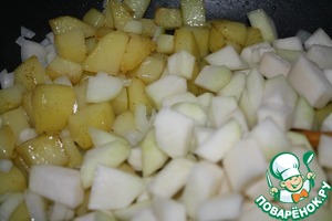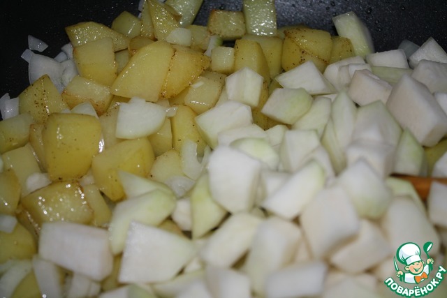 Затем добавляем лук и кольраби, жарим еще минут 6.