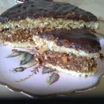 Торт невероятно вкусен! Очень нежный и пористый бисквит, вкуснейшая прослойка, с кусочками орехов и хрустящих крекеров. Единственное отступление от рецепта - я слегка пропитала коржи крепким сваренным кофе с добавлением коньяка... Это просто ммммммммм...