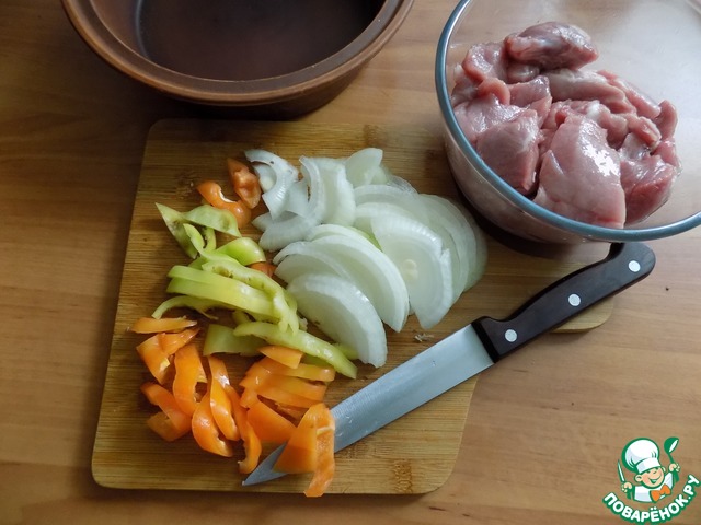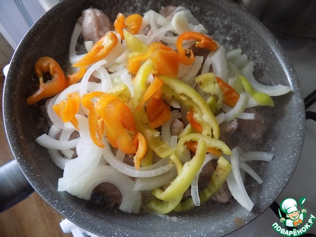 Мясо замариновалось. Перед отправкой в духовку мясо нужно обжарить с луком и перцем, чтобы не превратить всё "в кашу".