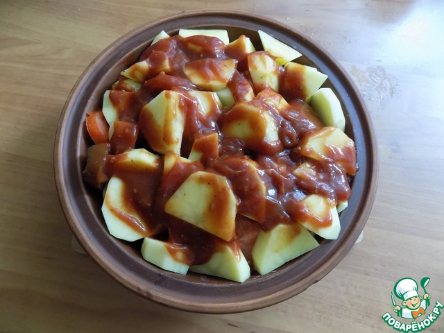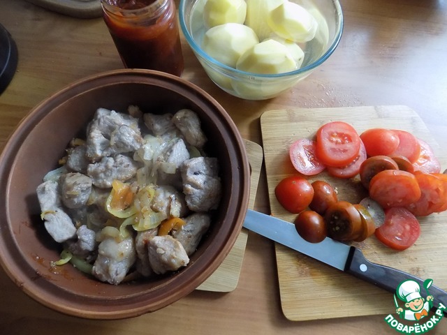 Выкладываем со сковороды мясо в кеци. Нарезаем картофель дольками и помидоры. -