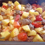 На мясо укладываем помидоры и картофель, сверху-соус. Ставим в духовку до готовности блюда. У меня ушло 40 минут при т-180 С. Ориентируйтесь по своей духовке. В процессе можно перемешать.