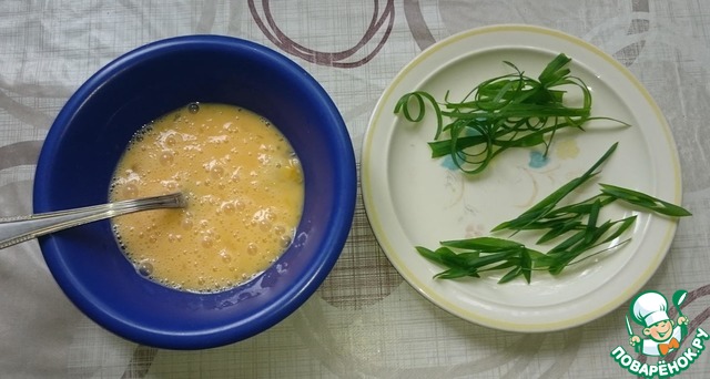 Два яйца взбалтываем в миске. Зеленый лук нарезаем наискосок, а можно вдоль пера тонкими полосочками. Так интереснее. Они закручиваются и будут в супе похожи на лапшу.
