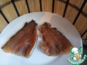 Острым ножом отделяем мякоть от хребта. У мужа получилось 4 кусочка филе без костей.
