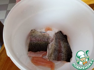 Далее рыбку промываем под холодной проточной водой, чтобы смыть соль. Степень промывки определяется отщипыванием кусочка и дегустацией. По вкусу она должна быть, как малосолёная форель. И вывешиваем сушиться.