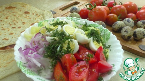 Смешанный салат выкладываем на тонкий лаваш и заворачиваем конвертом.