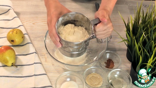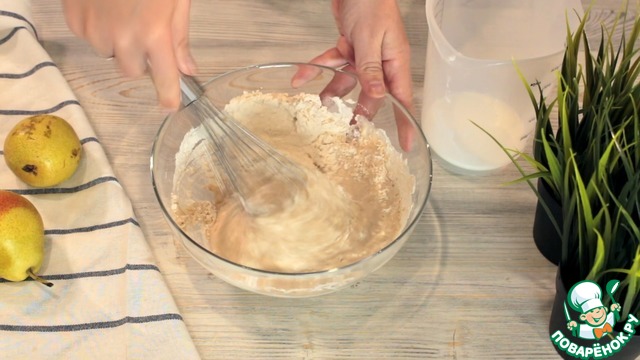 Добавляем грушу к мучной смеси, туда же добавляем растительное масло и молоко. Замешиваем тесто без комочков.