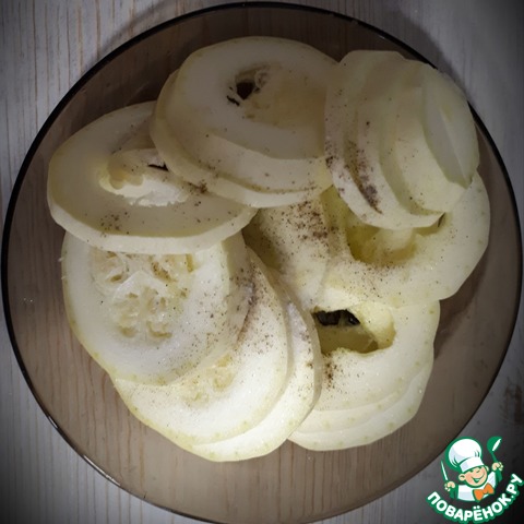 Порежем баклажаны кольцами (желательно одинаковыми по толщине). Посолить и поперчить по вкусу. -
