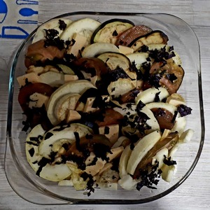 Выкладываем наши кольца баклажана, кабачка, помидоры в любой очередности, последовательности, как вашей фантазии угодно. Вкладываем сыр между овощами.