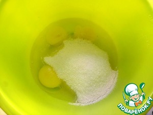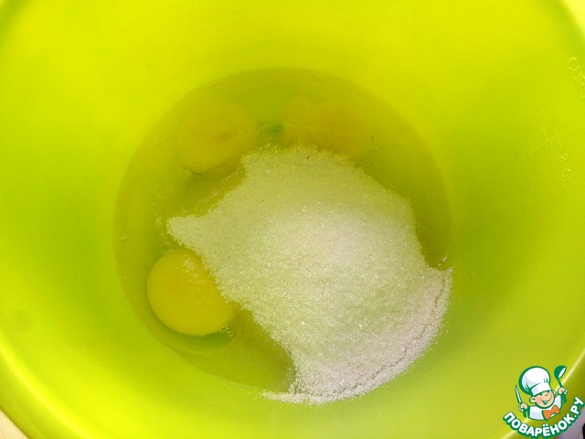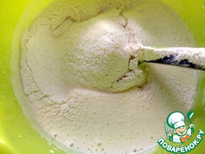 Добавить растительное масло, перемешать. Затем добавить муку, смешанную с разрыхлителем, перемешать.