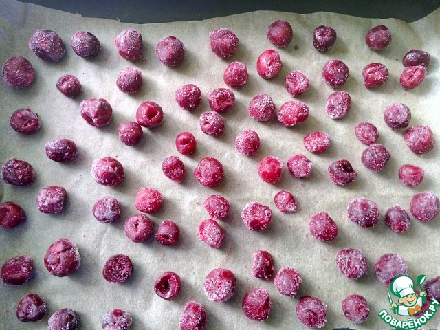 На дно формы (размер 25х35 см) выложить вишню (замороженную не размораживать).