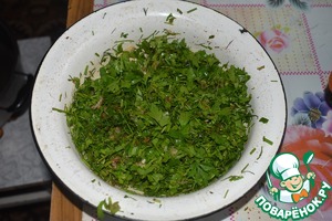 Чистую зелень мелко нарезать и смешать с измельченным чесноком, черным и красным (по желанию) перцем.
