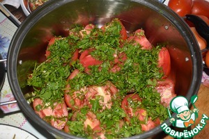Уложить слоями в кастрюлю с широким дном: слой помидоров срезом вверх - на них зелень - и так до конца.