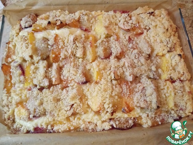 Прекрасное сочетание мягкого теста, нежного творожного слоя, сочного фруктового слоя и хрустящей сахарной корочки. Пирог получается столь же насыщенным, как и торт. Можно использовать любые другие фрукты или ягоды.