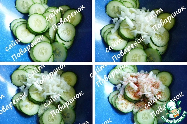 Огурцы вымыть, нарезать тонкими кружками, добавить измельченный лук,