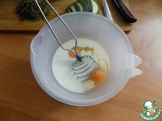 Берём посуду, наливаем молоко и разбиваем яйца. Подсаливаем по вкусу (не забывая про сыр). Венчиком подвзбиваем.