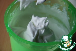 Для муссового слоя достать заранее сметану и белки (должны быть комнатной температуры). Подготовить вишню. Белки взбить с щепоткой соли на низких оборотах до плотной пены. Затем постепенно добавлять сахар и взбивать на бОльших оборотах.