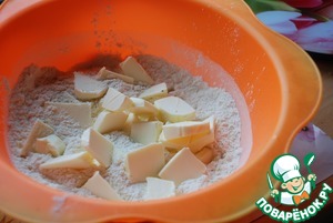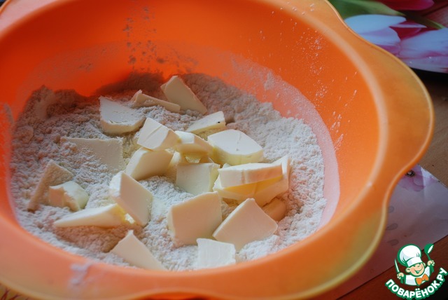Муку смешать с разрыхлителем, добавить охлаждённое масло и вилкой перемешать в крошку.