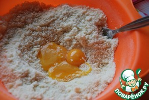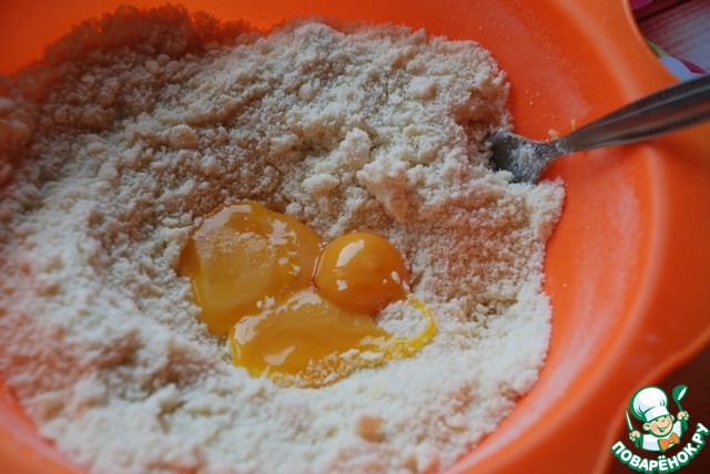 Добавить желтки яиц и замесить тесто. (У меня были мелкие яйца, поэтому я брала три). Если очень круто, можно добавить 1 ст. л. ледяной воды.