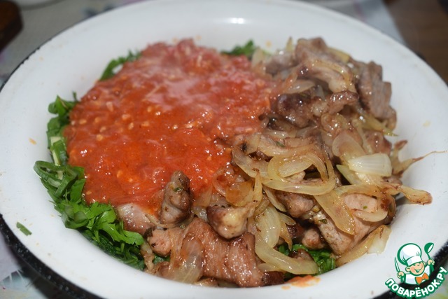 • Нарезать луковицу полукольцами и добавить к мясу. Жарить все до готовности лука. Посолить, поперчить.