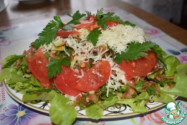 На блюдо для подачи выложить зеленые листья салата. Затем сам салат. Украсить тертым сыром, дольками 0,5 помидора и зеленью.