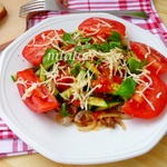Вкусный салат, ничем не хуже обычного овощного, с обычным соусом типа "Цезарь"...поэтому не вижу смысла в тушении помидора...приготовление занимает просто больше времени...Все равно попробовала, автору спасибо)