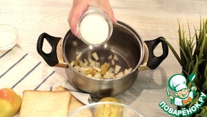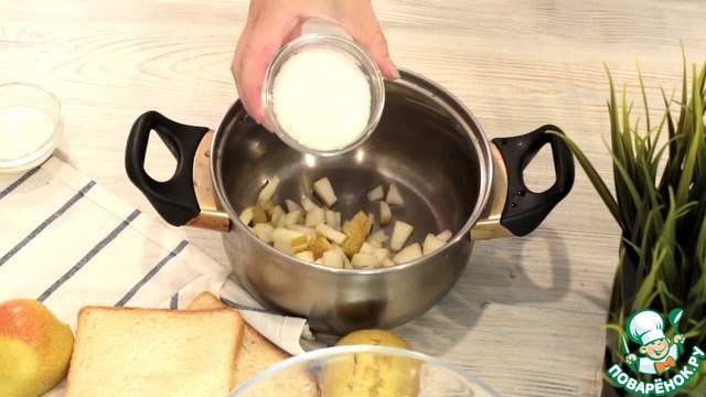 Грушу нарежем на мелкие кубики. Затем берем сотейник или кастрюлю с толстым дном, выкладываем грушу, сахар – 2 ст. л., воду. Ставим на средний огонь и увариваем в течении 10 минут.