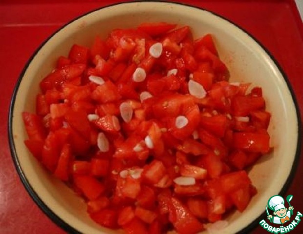 Для фарша спелые помидоры нарезать небольшими ломтиками, посолить их немного, добавить чеснок по вкусу.
