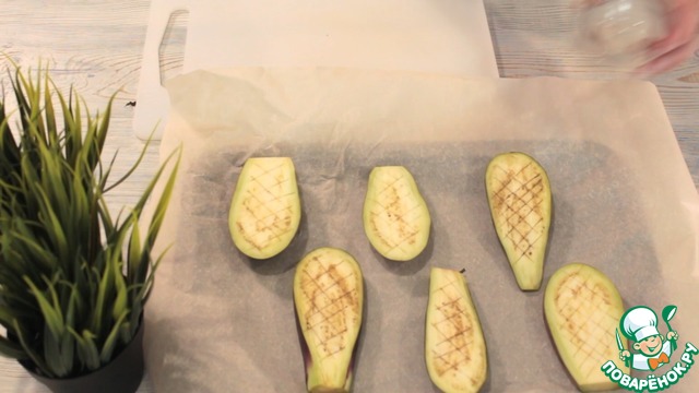 Смазываем поверхность баклажанов немного растительным масло и ставим в разогретую до 200 градусов духовку примерно на 15 минут. Баклажаны должны полностью приготовиться.