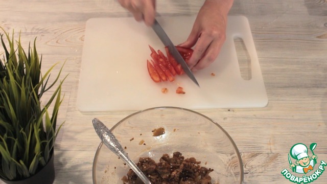 Берем помидор, убираем часть, где много жидкости. Нарезаем на кубики. -