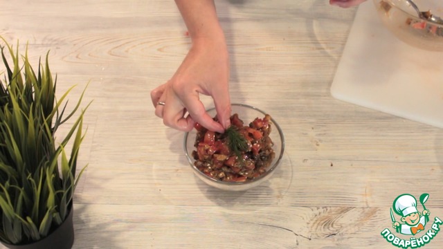 Затем остужаем баклажаны, убираем кожуру. И тут несколько вариантов. Можно нарезать, как я, на маленькие кубики, а можно измельчить в бленедере. Нарезанные на маленькие кубики мне нравятся больше - у них будет текстура.