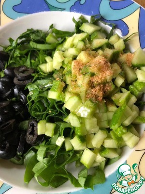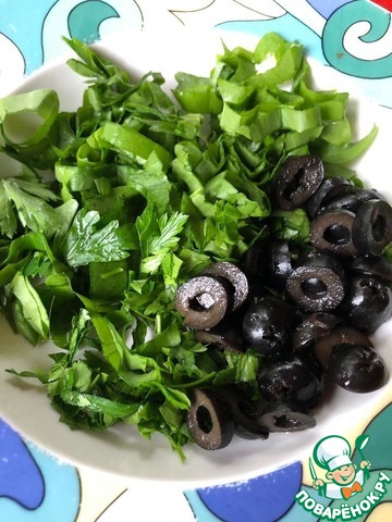 Щавель нашинковать, петрушку мелко нарезать. Маслины нарезать кружочками.