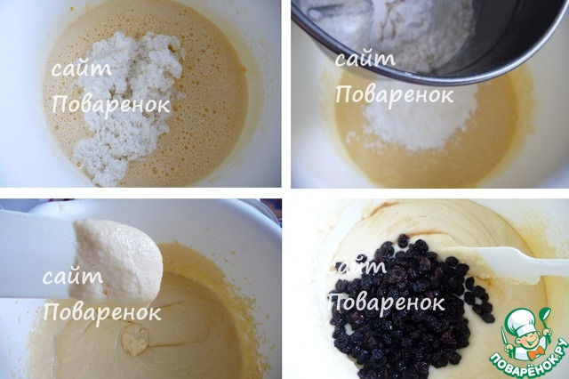 Муку смешать с разрыхлителем теста, просеивая добавить в массу.