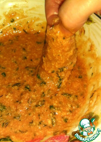 Яйца взбить с солью и томатной пастой до однородности и растворения томатной пасты. Солить кляр осторожно, учитывать солёность сыра.