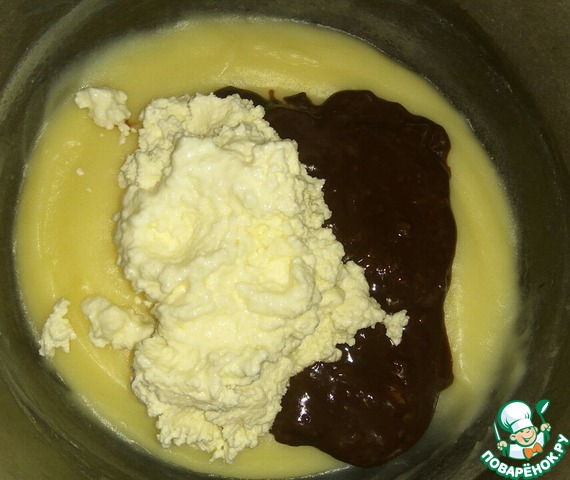 В немного остывший крем добавить растопленный шоколад и протертый через сито творог.