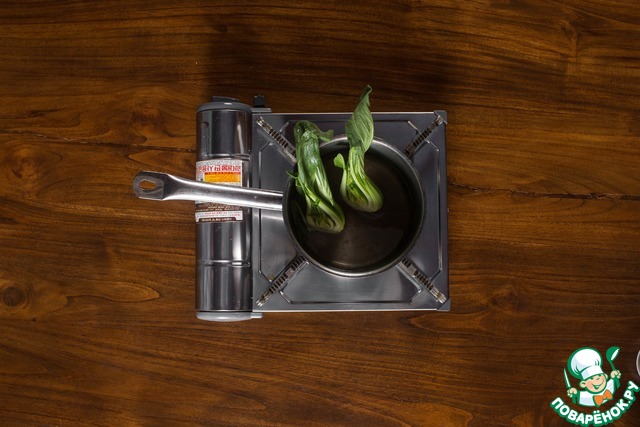 Капусту пак-чой опустите толстой частью в кипящую воду и бланшируйте 30 секунд, потом на пару секунд опустите в кипящую воду весь кочан и откиньте на сито.