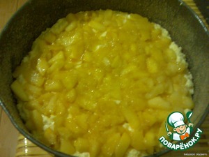 Выложить на дно половину творожной смеси, затем тушёные яблочки и сверху вторую половину смеси.