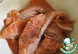 • Рыбное филе разрезать на порции, полить лимонным соком, немного посолить.