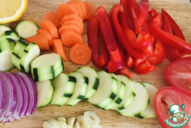 • Перец очистить от семян, порезать полосками. Морковь очистить, порезать кружочками. Лук нарезать перьями. Чеснок очистить, нарезать кружочками. Цукини очистить, порезать кружочками.