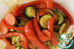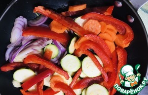 • 2 ст. ложки растительного масла налить на сковороду, добавить нарезанный чеснок, перец, морковь, цуккини и лук. Обжарить около 10 минут, помешивая.