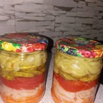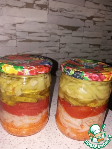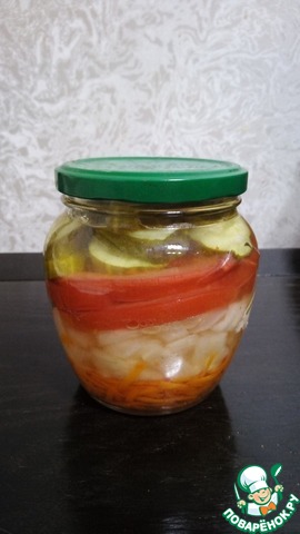 Слоеный салат на зиму, вкусный и простой. Добавить вариантом к существующим рецептам не могу - уровень не позволяет. Делаю заготовку много лет подряд, рецепт взят из газеты "Марь Ванна. Пропорции овощей даю банку 0,5 литра. Великолепно хранится в кладовке. Приготовьте, не пожалеете!