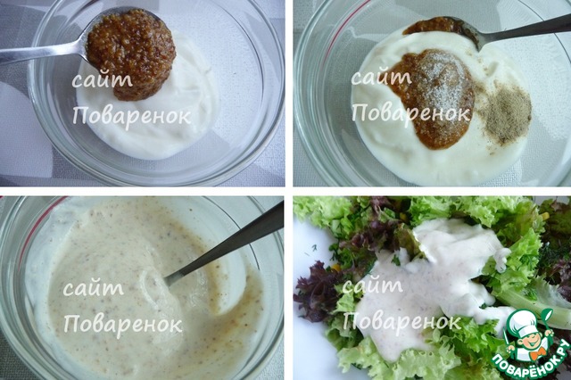 Смешать йогурт, семена горчицы, соль, белый перец, перемешать.