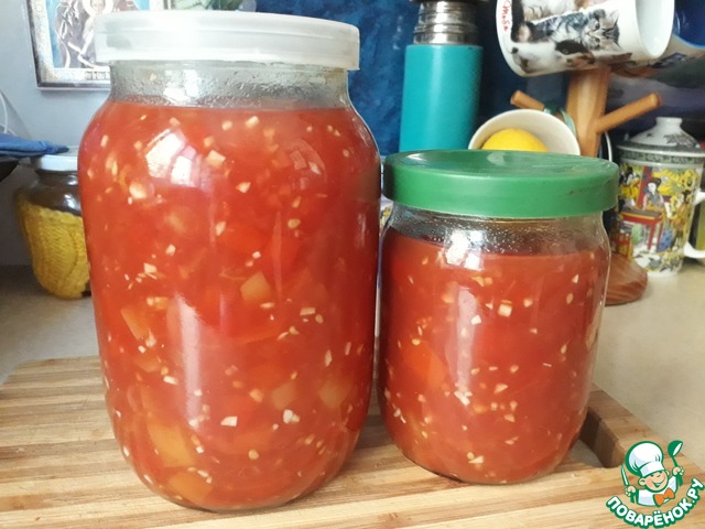 Добавляем сахар, соль, чеснок. Перемешиваем, доводим до кипения, варим ещё 5 минут и выключаем. Разложить по стерилизованные банкам, закатать, перевернуть, укутать.
