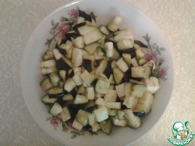 Баклажаны нарезаем кружками, затем замачиваем на 30 минут в соленой воде, чтобы ушла горечь. Отжимаем слегка и нарезаем кусочками