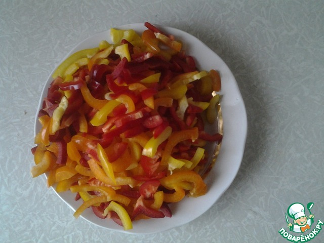 Сладкие перцы берем разноцветные и нарезаем дольками