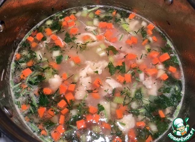 В 1.5 литрах воды сварить бульон из курицы. Получается прозрачный бульон.