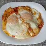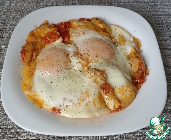 Можно запечь так, чтобы белок схватился, а желток был жидким, тогда его аккуратно размешивают с сыром и помидором уже при поедании. -