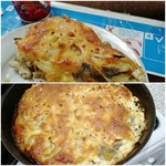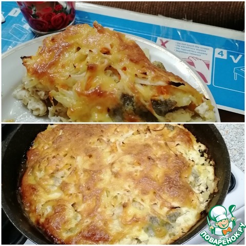 Филе перекладываем в форму для запекания. Солим, перчим, выкладываем зажарку и поливаем заливкой.