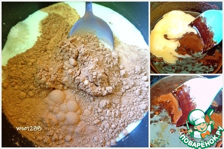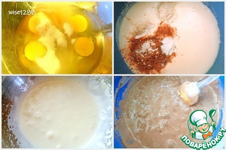 Приготовить шоколадный бисквит: яйца взбить с сахаром и солью не менее 7 минут. Включить разогреваться духовку до 180 градусов. К яичной смеси добавить ванилин, разрыхлитель, муку, какао. Перемешать.
